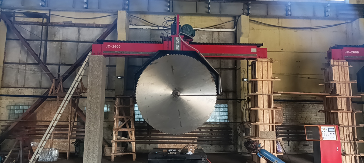 Станок JC-2600 со столом и направляющими. Используется для распиловки блоков и заготовок из природного камня и подобных материалов. В качестве режущего инструмента станка используется дисковая пила размером до 2500мм.